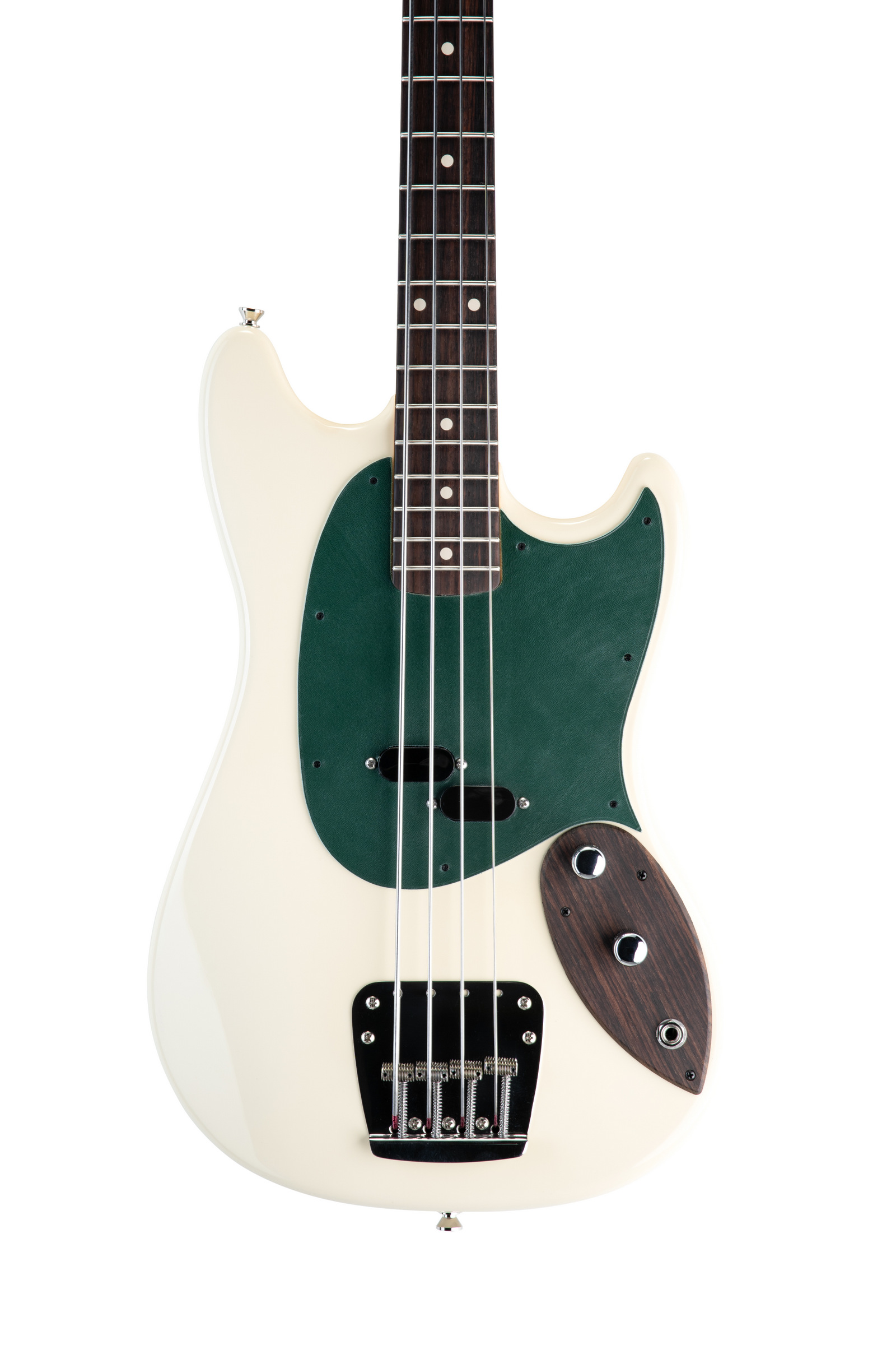 Jones Musical Instruments’ short scale model, this Mach II bass in Olympic White features a custom green leather pickguard with a color matched headstock. Seymour Duncan’s Mustang pickups, a custom vintage bridge and Labella Strings combine to create a powerful, punchy sound in a small package.