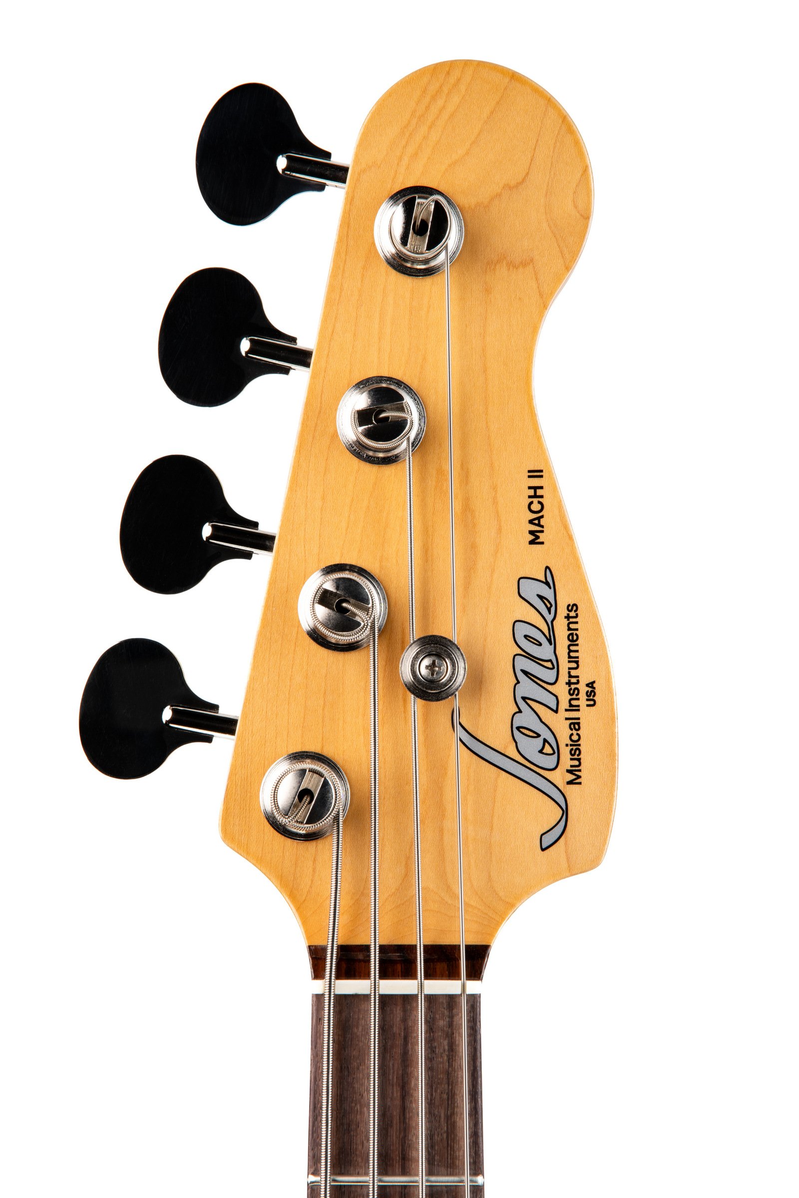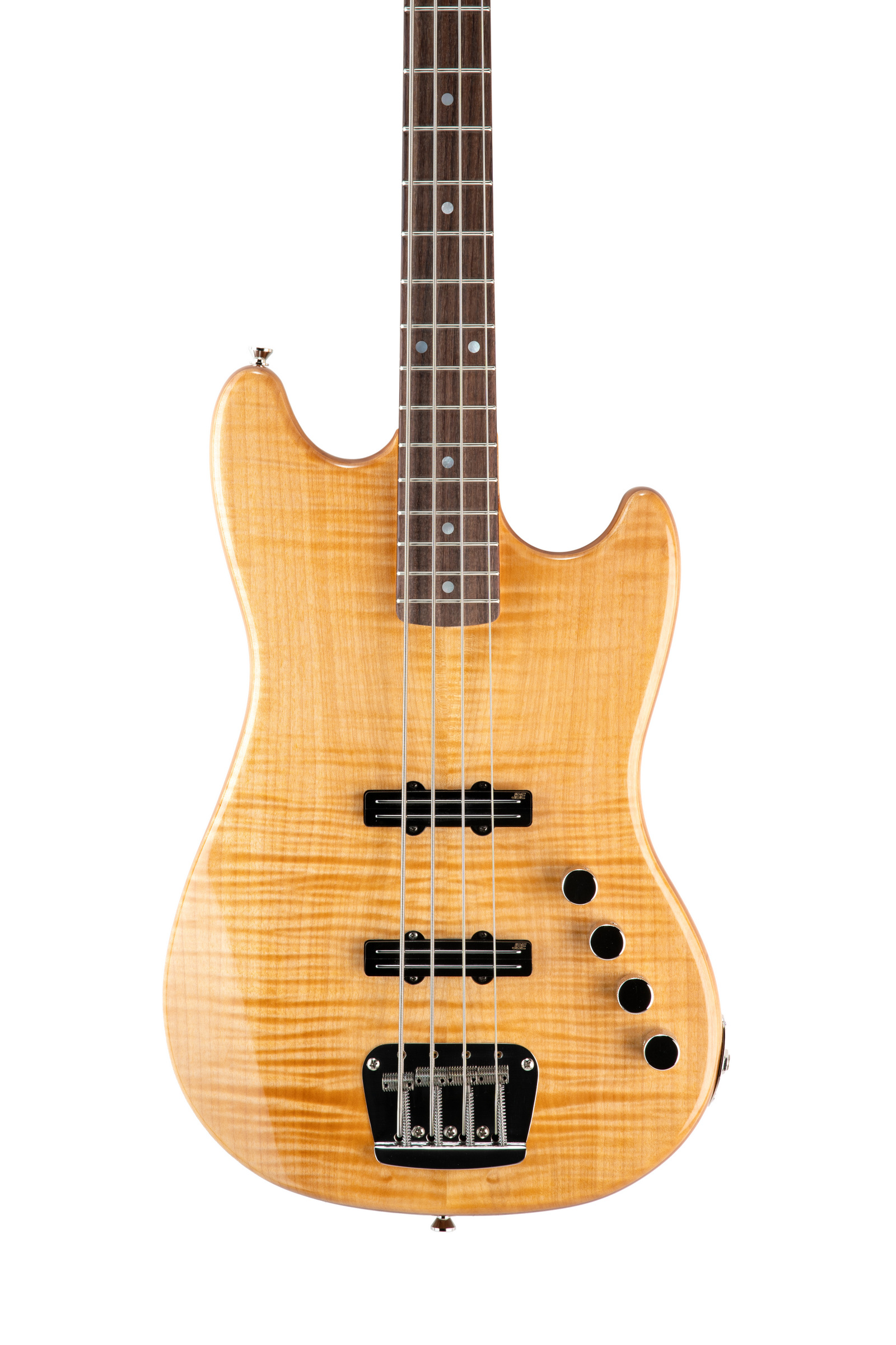This 30” bass with a flame maple top over an alder body, sports chrome Hipshot lollipop tuners and chrome knobs. This bass is a departure from the classic Mustang design. It features 2 single coil J style pickups mounted on our short scale platform.