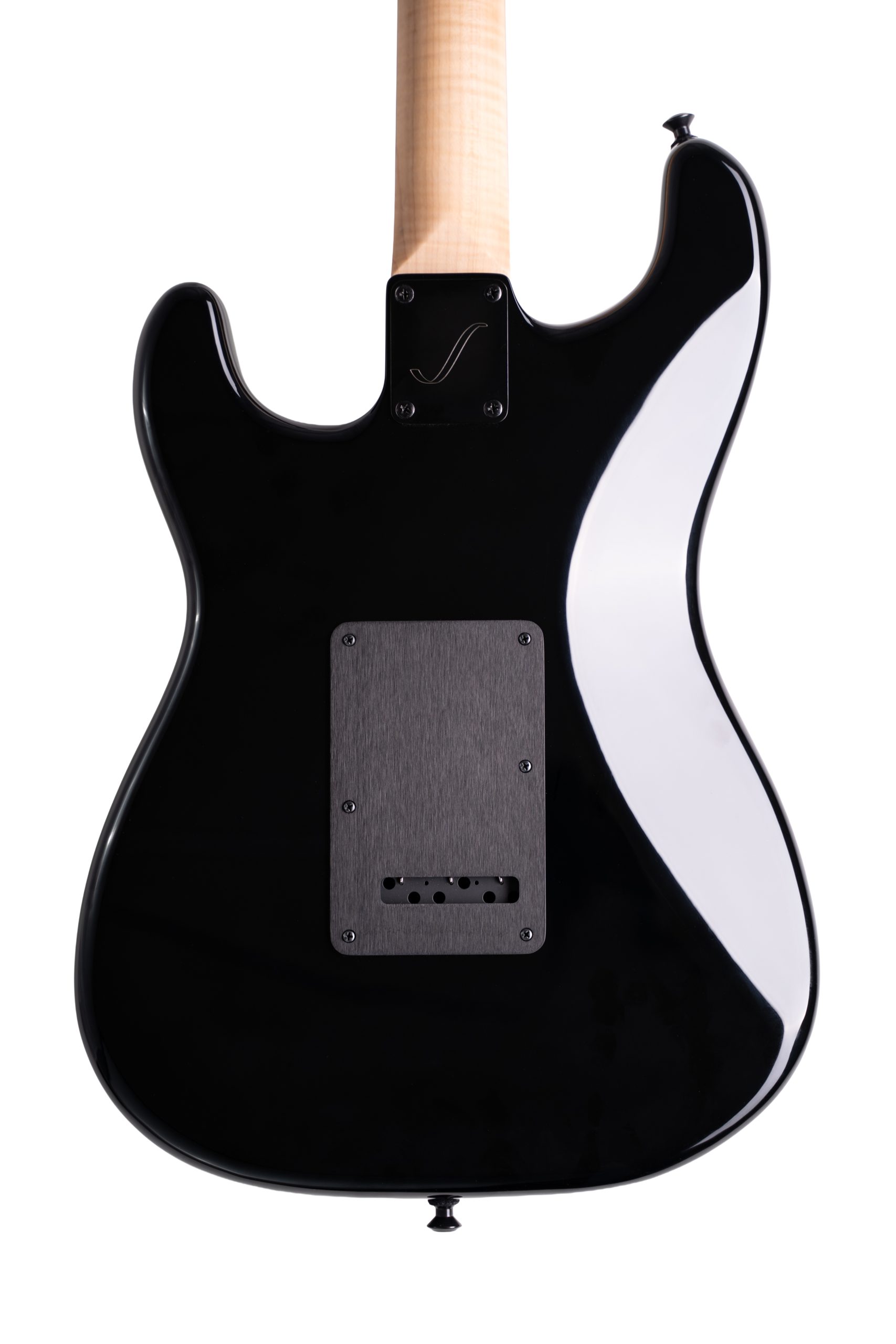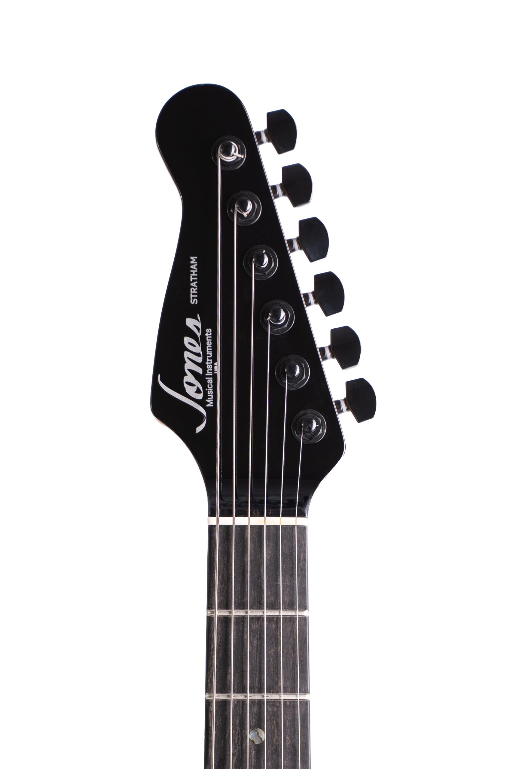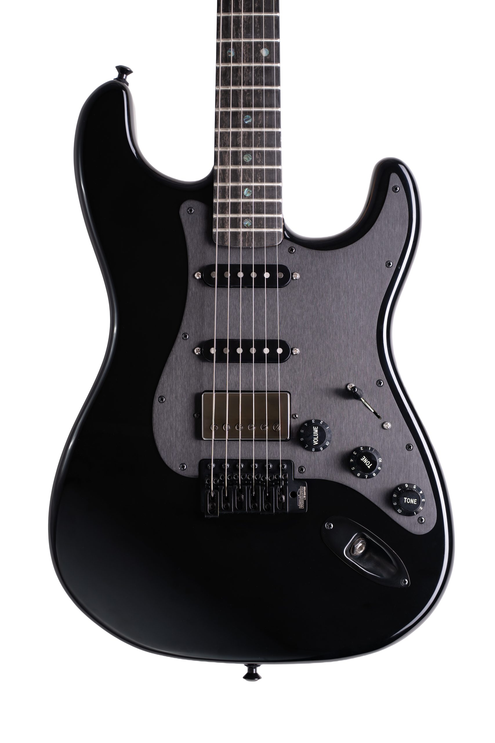 Bet on black with this SSH (single, single, humbucker) triple black Stratham. Black finish, black anodized aluminum pickguard and ebony fretboard. Add to that, the iconic reversed headstock. Though thought of as primarily cosmetic, a reverse headstock offers a longer bridge to tuning head length for the heavier strings. This provides a different tension and feel.