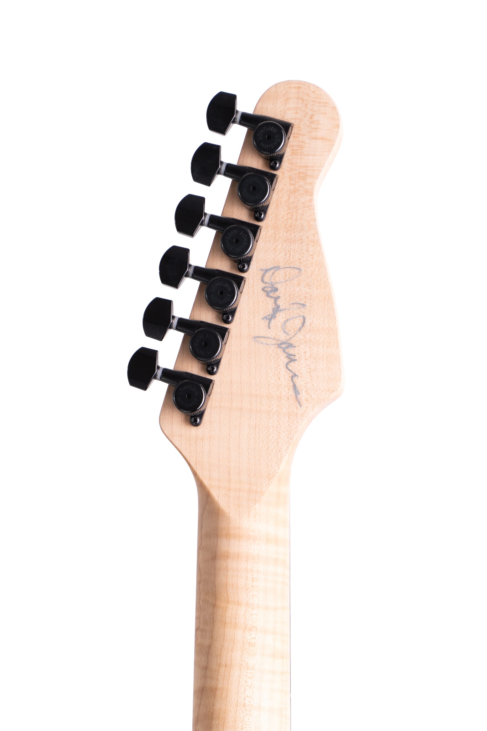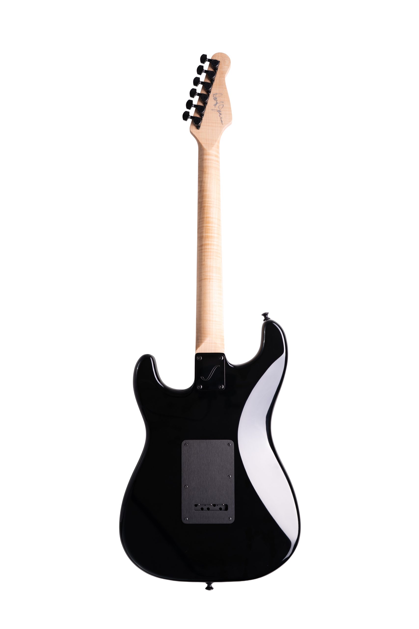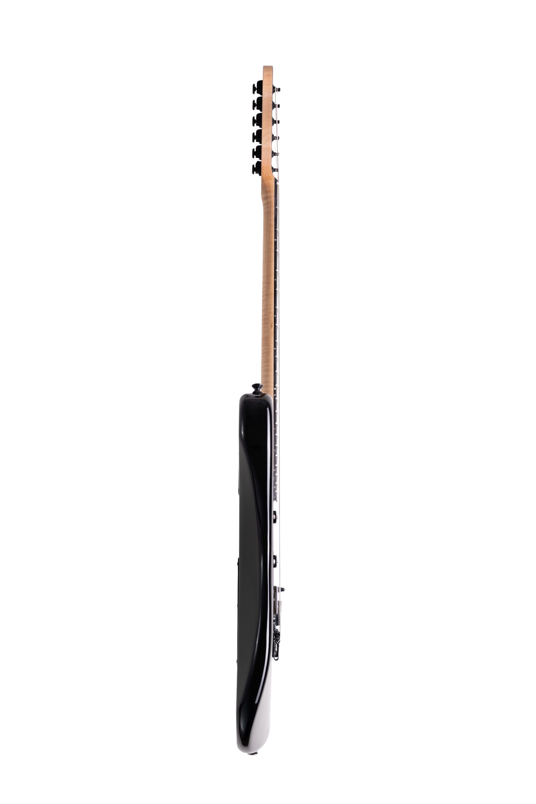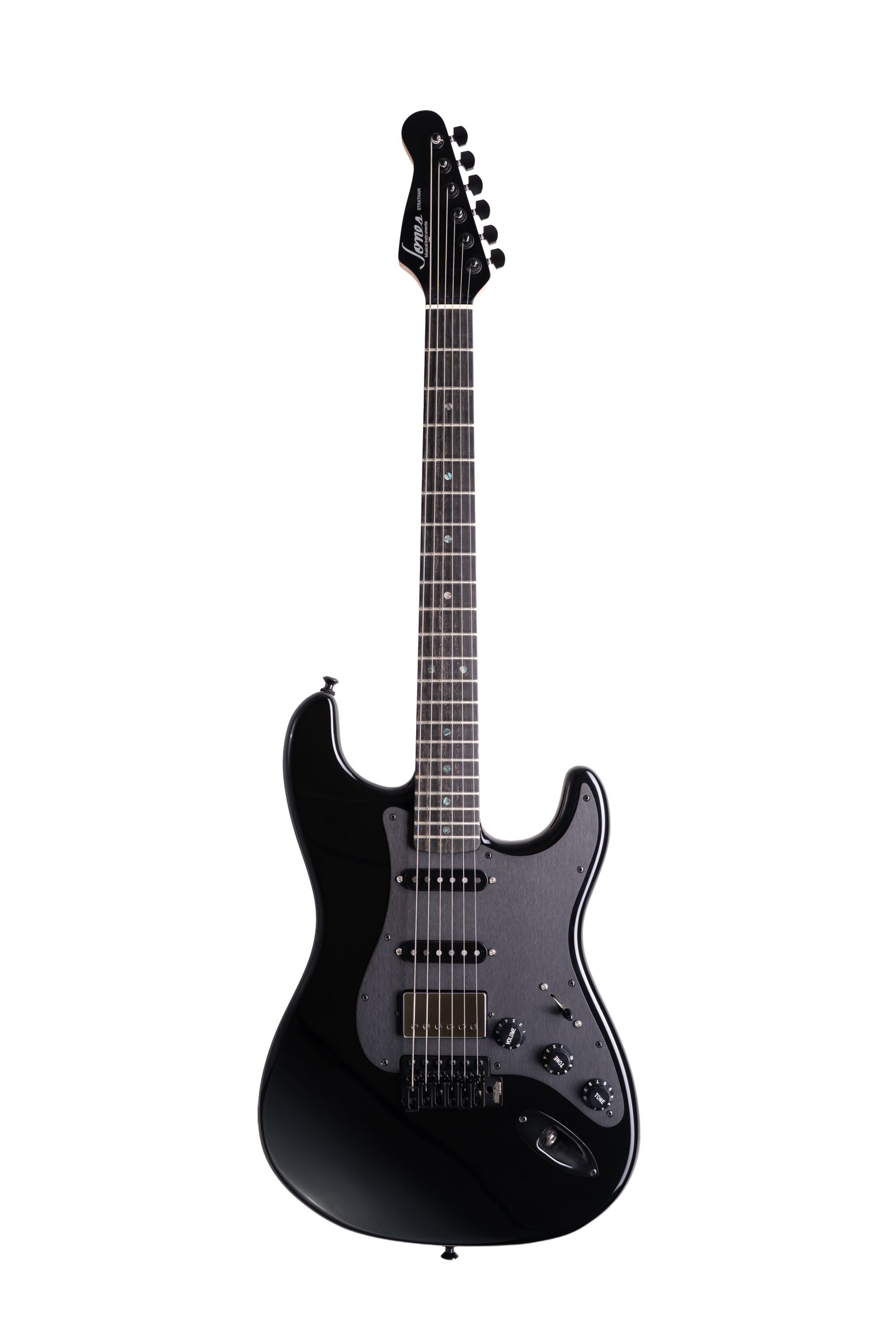 Bet on black with this SSH (single, single, humbucker) triple black Stratham. Black finish, black anodized aluminum pickguard and ebony fretboard. Add to that, the iconic reversed headstock. Though thought of as primarily cosmetic, a reverse headstock offers a longer bridge to tuning head length for the heavier strings. This provides a different tension and feel.