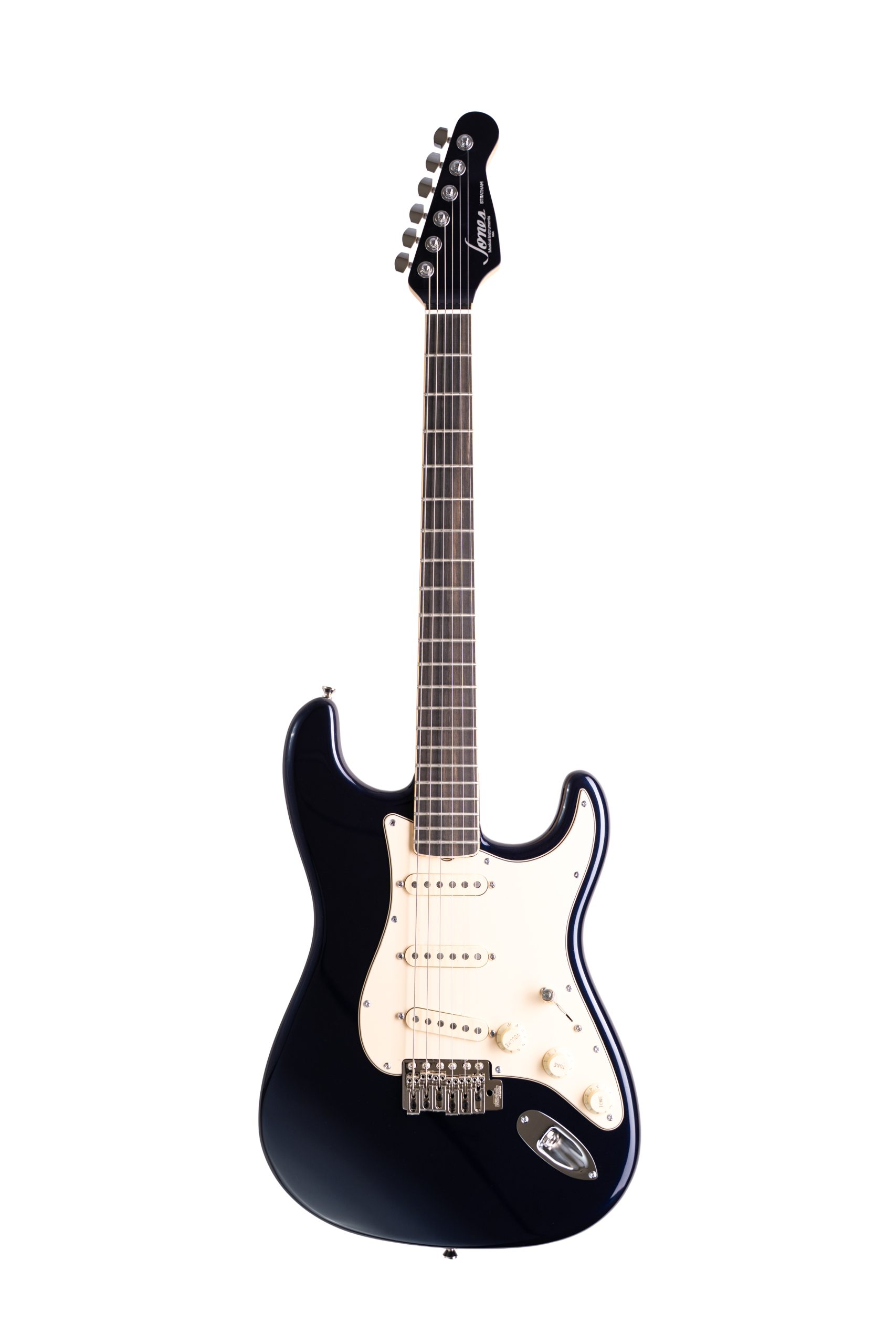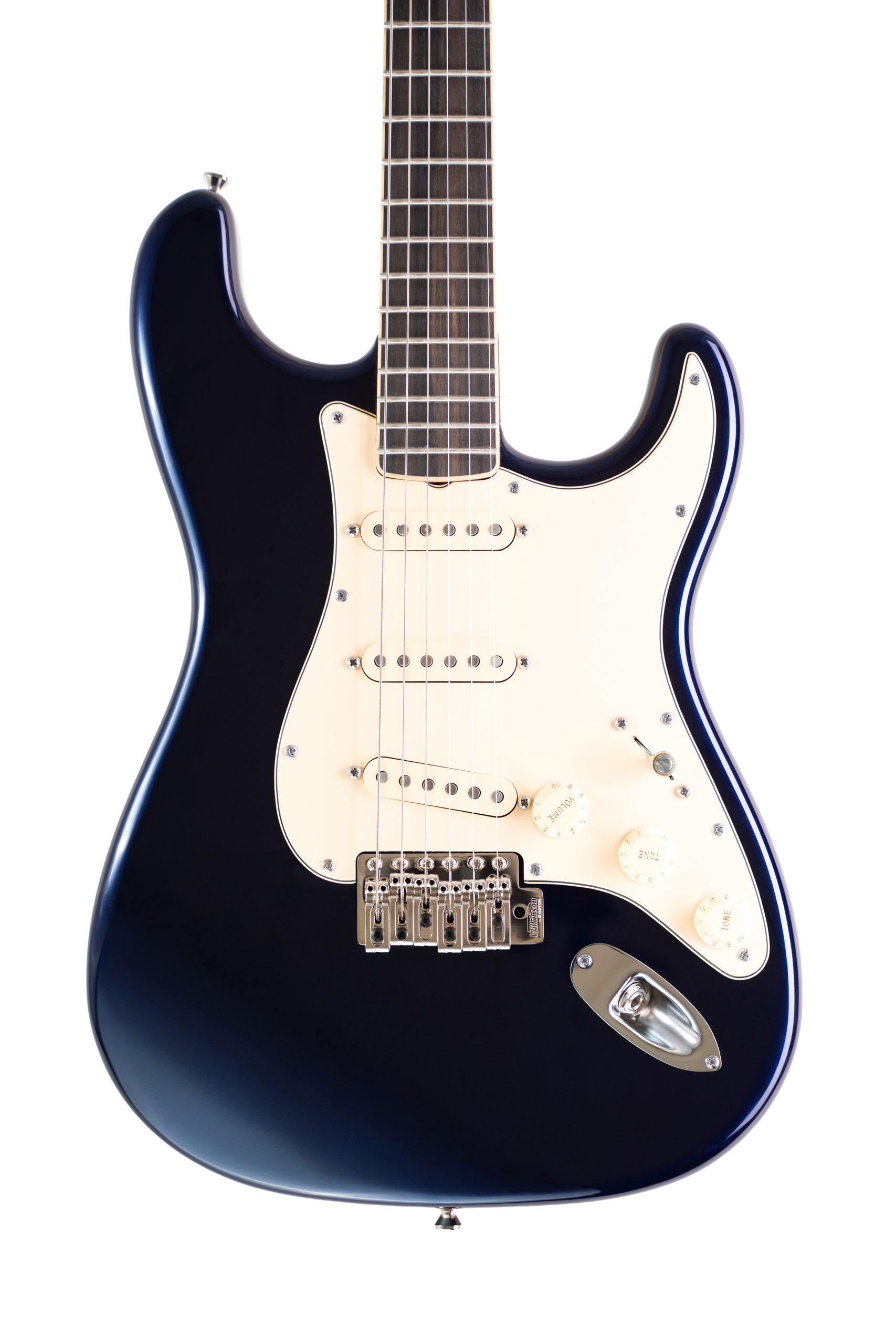 Infinitely adaptable with classy upgrades. This SSS (triple single coil) pickup model offers several variations in tones. From searing leads to crystalline chimes to a throaty rhythmic crunch. The neck is bound with cream colored binding. A cream pickguard matches beautifully. The ebony fingerboard is a classy upgrade from the standard rosewood. Our first Midnight Blue finish adds understated elegance.