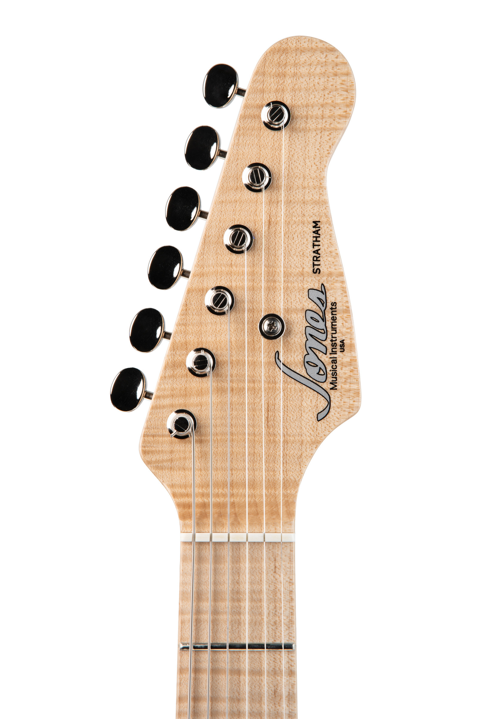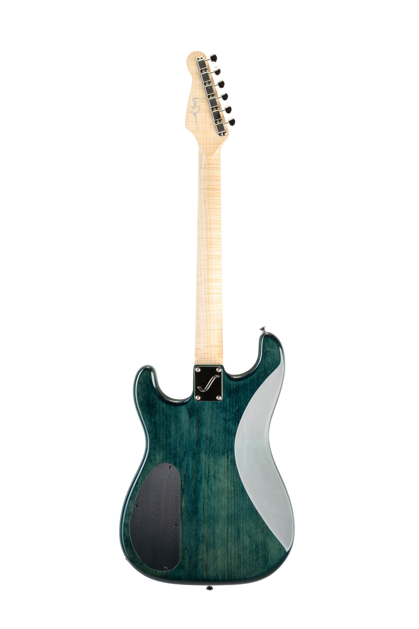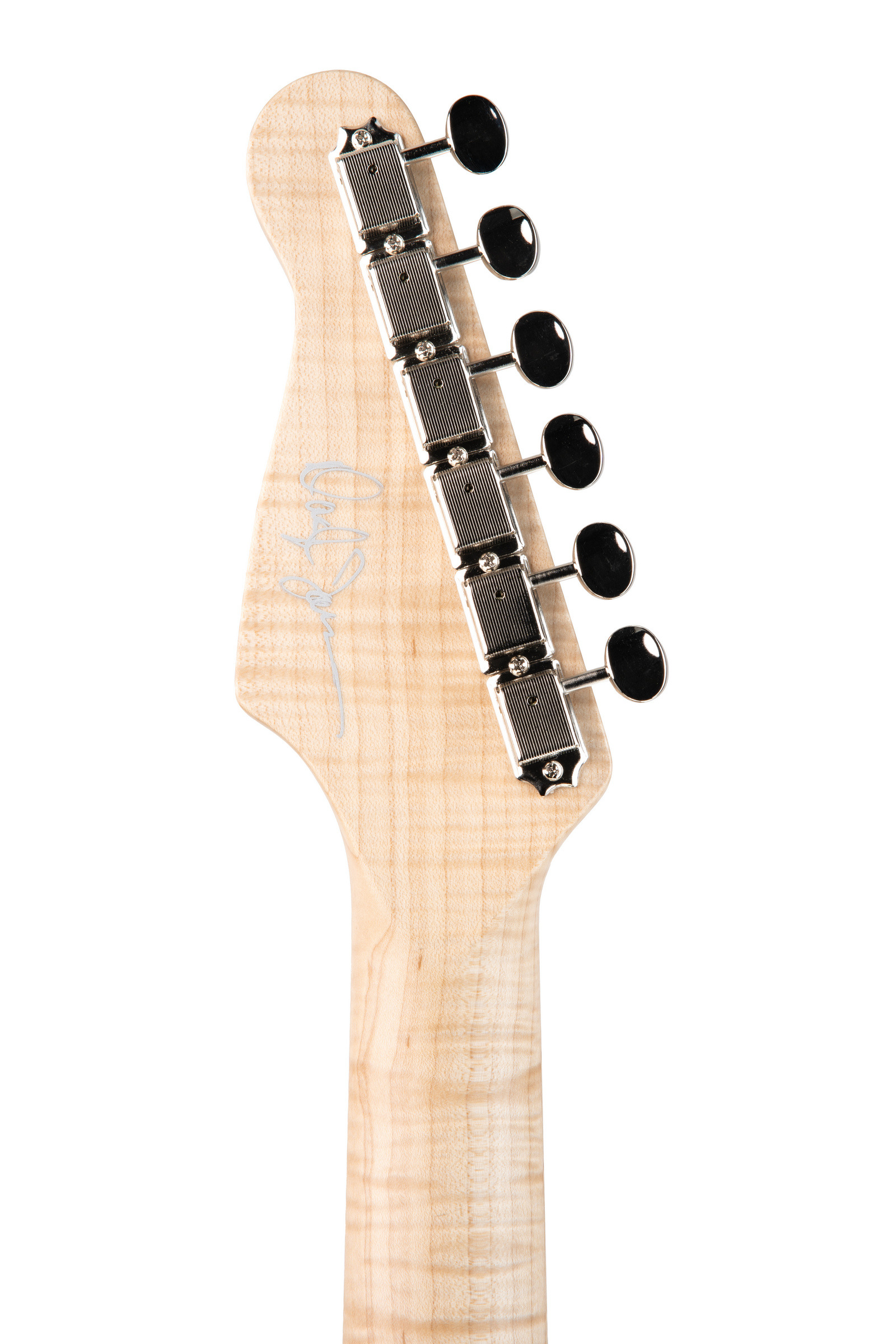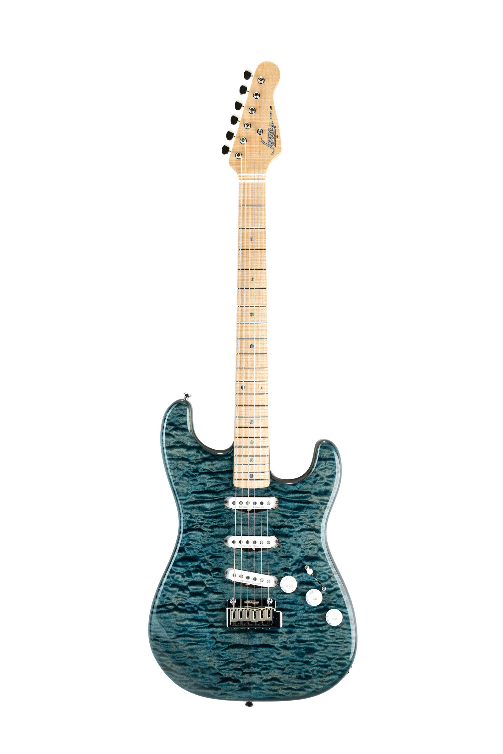 This guitar with a stunning quilt maple top over an alder body is shown here in transparent Ocean Blue. It is paired with a striking flame maple neck with black abalone dots. Featuring a Wilkinson 2 point tremolo bridge, SD Custom single coil pickups, vintage style tuners and Labella Strings.